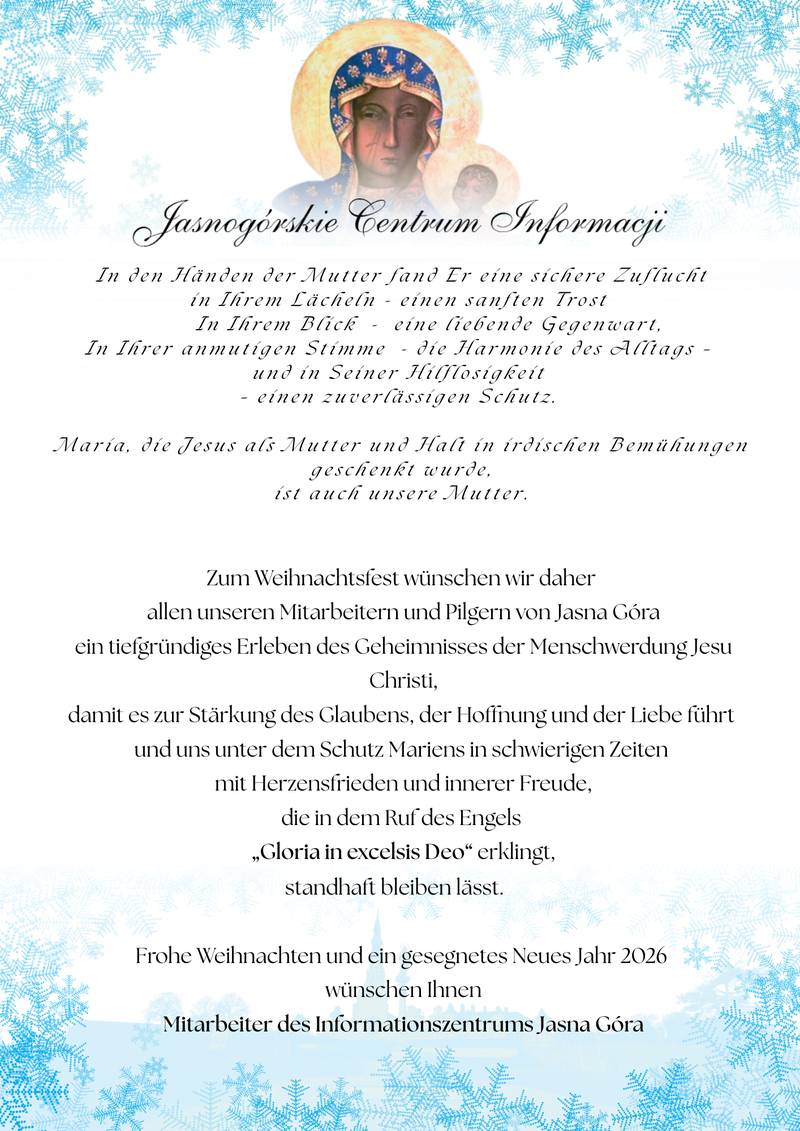 Dec. 22, 2024, 12:57 p.m., Jasnogórskie Centrum InformacjiSEHR VEREHRTE DAMEN UND HERREN!Für das bevorstehende Weihnachtsfest möchten wir Ihnen herzliche Wünsche übermitteln.Möge das …